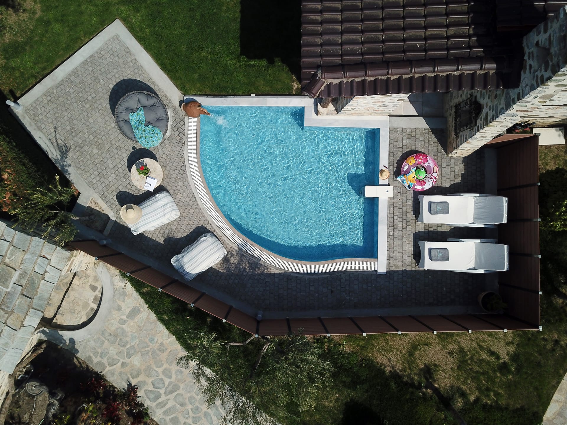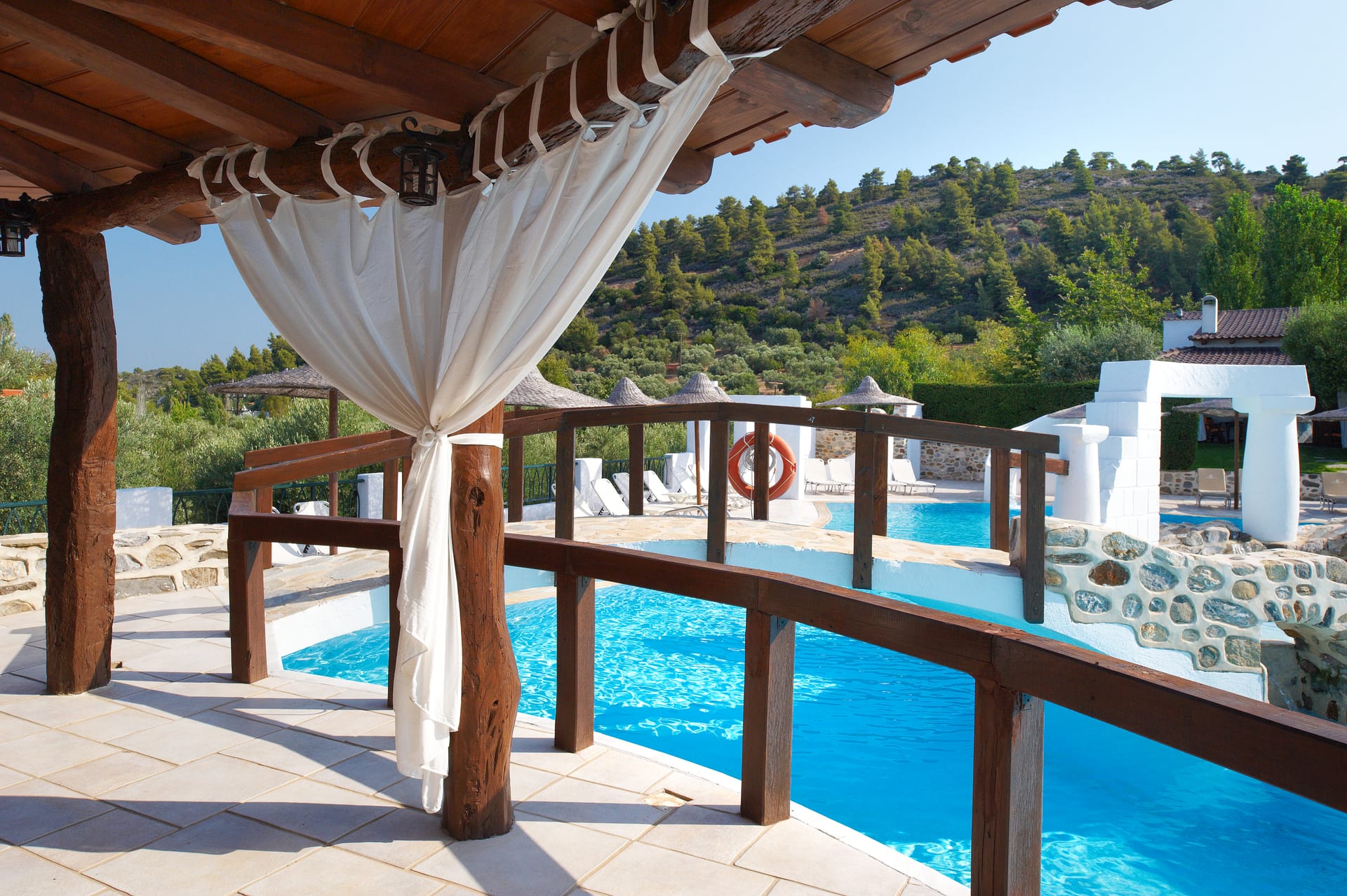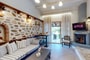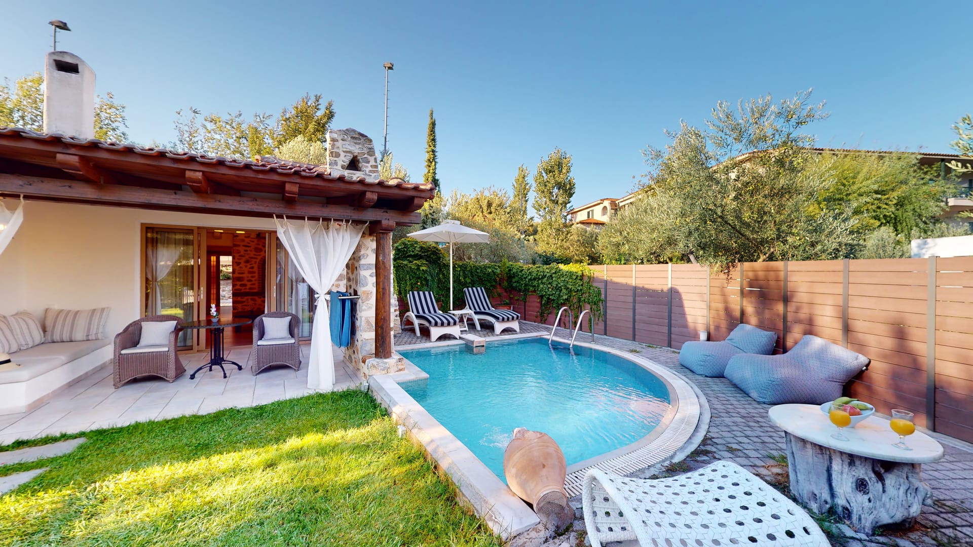 The maisonettes with private pool are 55 m2 on a green lawn. They are furnished with taste and contain a bedroom, a living room with a fireplace, and a second room with 2 single beds, approached with a wooden internal staircase. They contain 2 plasma satellite televisions, room service, a Minibar, wake-up call service, a safe, and individually adjustable air conditioning. All the houses include a stone balcony, a covered veranda with a sitting room & an individual pool.