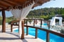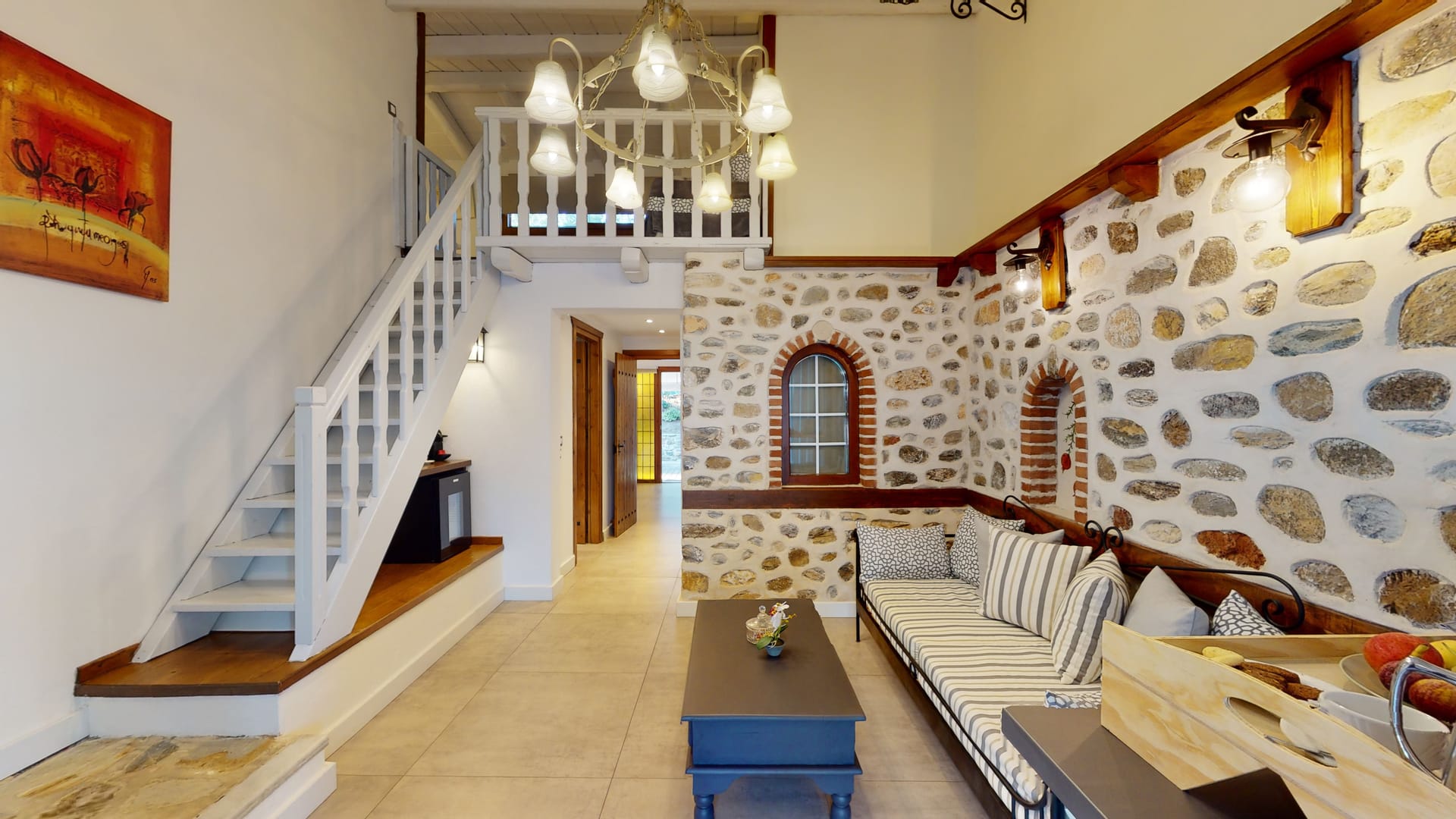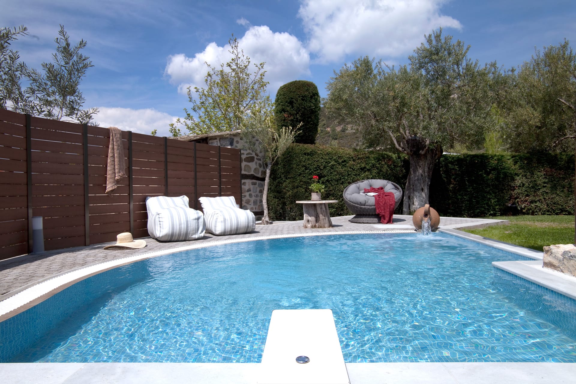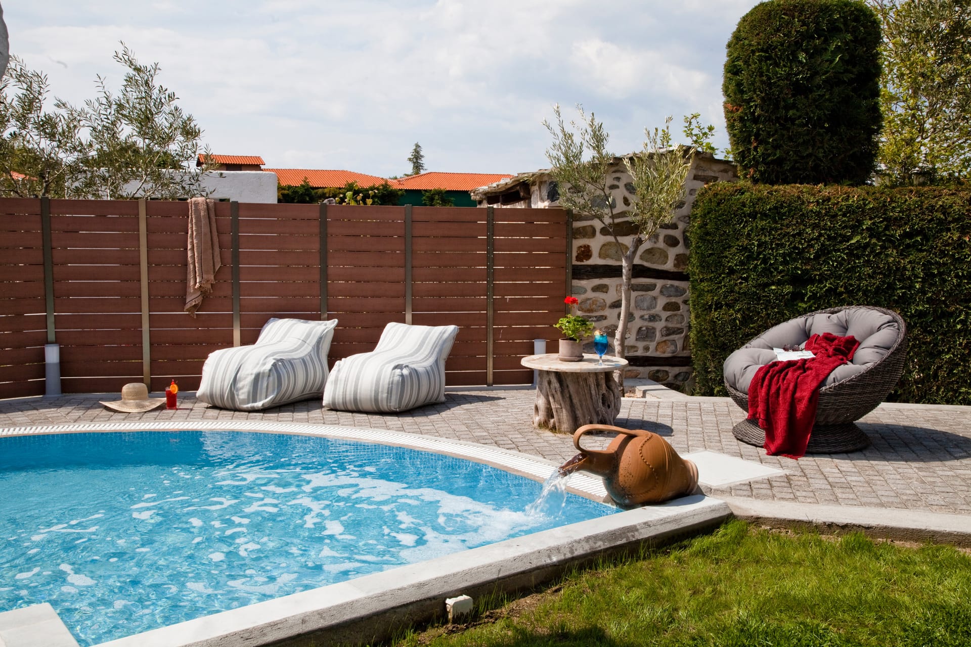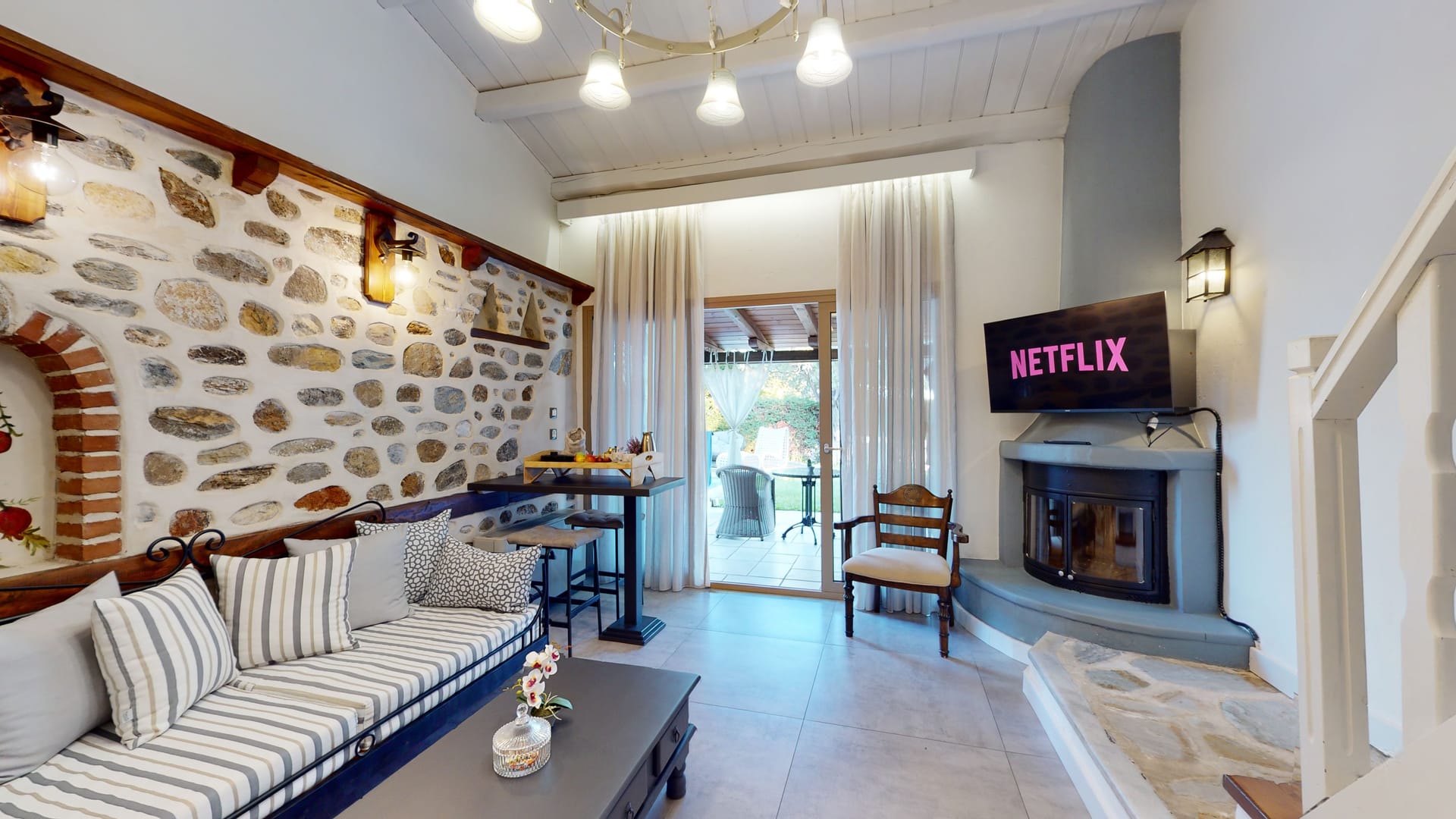 The maisonettes with private pool are 55 m2 on a green lawn. They are furnished with taste and contain a bedroom, a living room with a fireplace, and a second room with 2 single beds, approached with a wooden internal staircase. They contain 2 plasma satellite televisions, room service, a Minibar, wake-up call service, a safe, and individually adjustable air conditioning. All the houses include a stone balcony, a covered veranda with a sitting room & an individual pool.